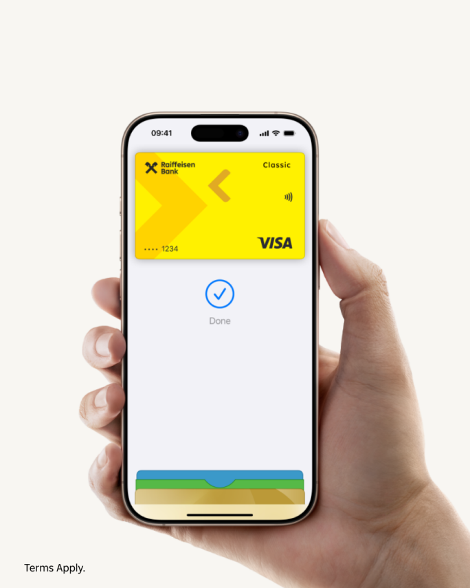 Apple Pay is a simple, secure, and private way to use your Raiffeisen card as an individual, Mastercard and Visa, on all your Apple devices. You can add your Raiffeisen Youth cards in Apple Pay: