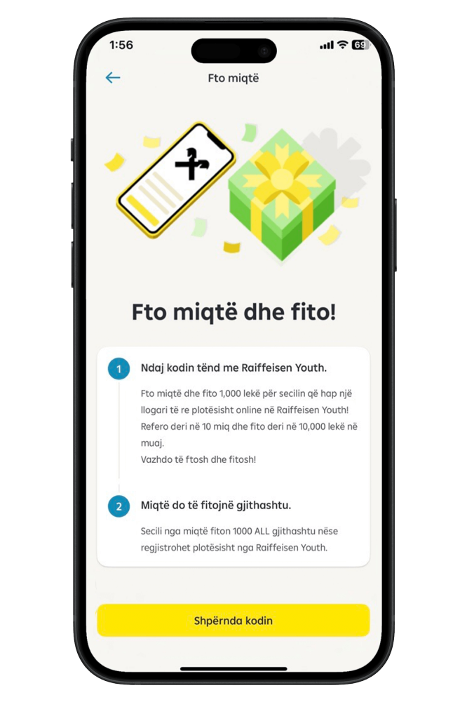 Çdo përdorues i Raiffeisen Youth ka një kod unik referimi, i cili gjendet lehtësisht në aplikacioni. Thjesht shpërndaje këtë kod me miqtë e tu përmes mesazheve, rrjeteve sociale apo mënyrës që ti preferon dhe ftoji të hapin një llogari tërësisht online sikurse ti. Për çdo mik që hap me sukses një llogari duke përdorur kodin tënd të referimit, ju të dy merrni menjëherë nga 1,000 Lekë bonus, drejtpërdrejt në llogaritë tuaja.