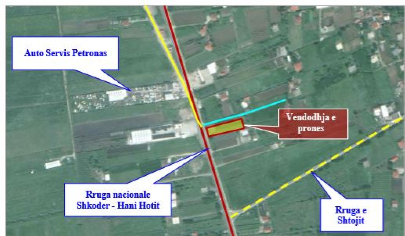 Siperfaqja e prones ka nje konfiguracion te rregullt drejtkendor.Sipërfaqe e përgjithëshme e rregjistruar është 1464 m2.Brinja me e gjate, me gjatesi 62,5 m e prones, eshte paralele me rrugen e Shtoit dhe brinja me e shkurter, me gjatesi 23,4 m, paralel me rrugen Shkoder – Hani i Hotit.Ne veri prona kufizohet nga nje rrugice e cila ben te mundur komunikimin me rrugen kryesore.Prona eshte e rrethuar me kolloncina betoni dhe rrethim me tela me gjemba nga te gjitha anet.Aksesi i hyrje-daljes per ne prone eshte ne anen veriperendimore , drejpersedrejti nga aksi i rruges Shkoder – Hani i Hotit.Ne veri prona kufizohet me nje rruge te perbashket dhe me parcela toke te lira e me tutje me nje ndertese 2 kt.Ne lindje prona kufizohet me toke are te lire.Ne jug prona objekt vleresimi kufizohet me parcele toke bujqesore te lire ne te cilen ndodhet edhe nje ndertese.Ne perendim prona kufizohet me nje kanal kullues dhe me rrugen kombetare Shkoder- Hani i Hotit.