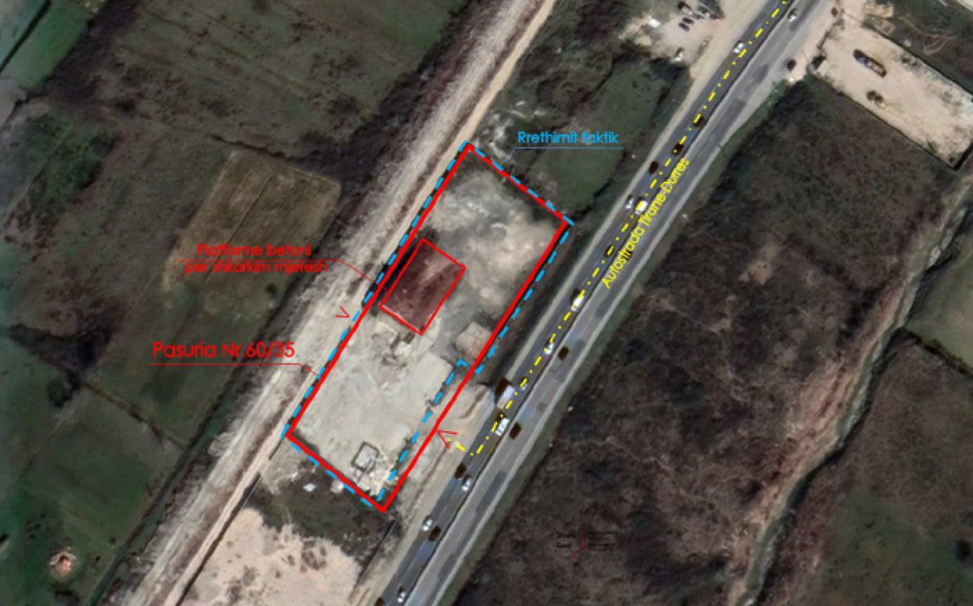 Prona ne fjale perbehet nga Truall dhe Ndertese. Prona ndodhet ne nje zone me reliev fushor, me akses te drejtperdrejte ne anen lindore te saj me Autostraden Tirane-Durres. Rrethimi i prones ne kufirin perendimor dhe jugor eshte me mur blloqe betoni me lartesi rreth 1.5 m, ndersa ne anen veriore dhe lindore me mur beton arme 1.0 m lartesi.Hyrja ne prone realizohet ne kufirin jug-lindor te saj. Mbi truall eshte ndertuar nje objekt 2 kate me sip.gjurme = 44.23 m2 (i cili eshte prishur se fundmi por nuk eshte hequr akoma nga dokumenti i pronesise). Zona ne te cilen ndodhet prona ka karakter kryesisht industrial dhe komercial.Ndertimet e zones jane kryesisht ndertesa me karakter industrial, komercial dhe tregtare si te tipit: kapanone dhe magazina industriale 1-2 kat, si dhe disa shtepi banimi.Infrastruktura rrugore eshte ne gjendje te mire teknike.